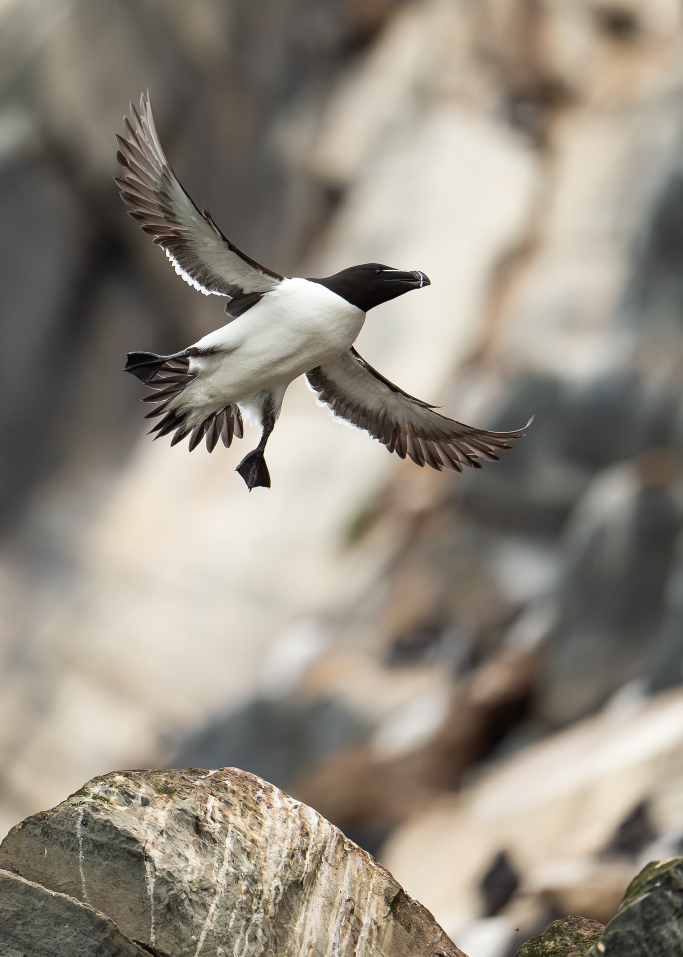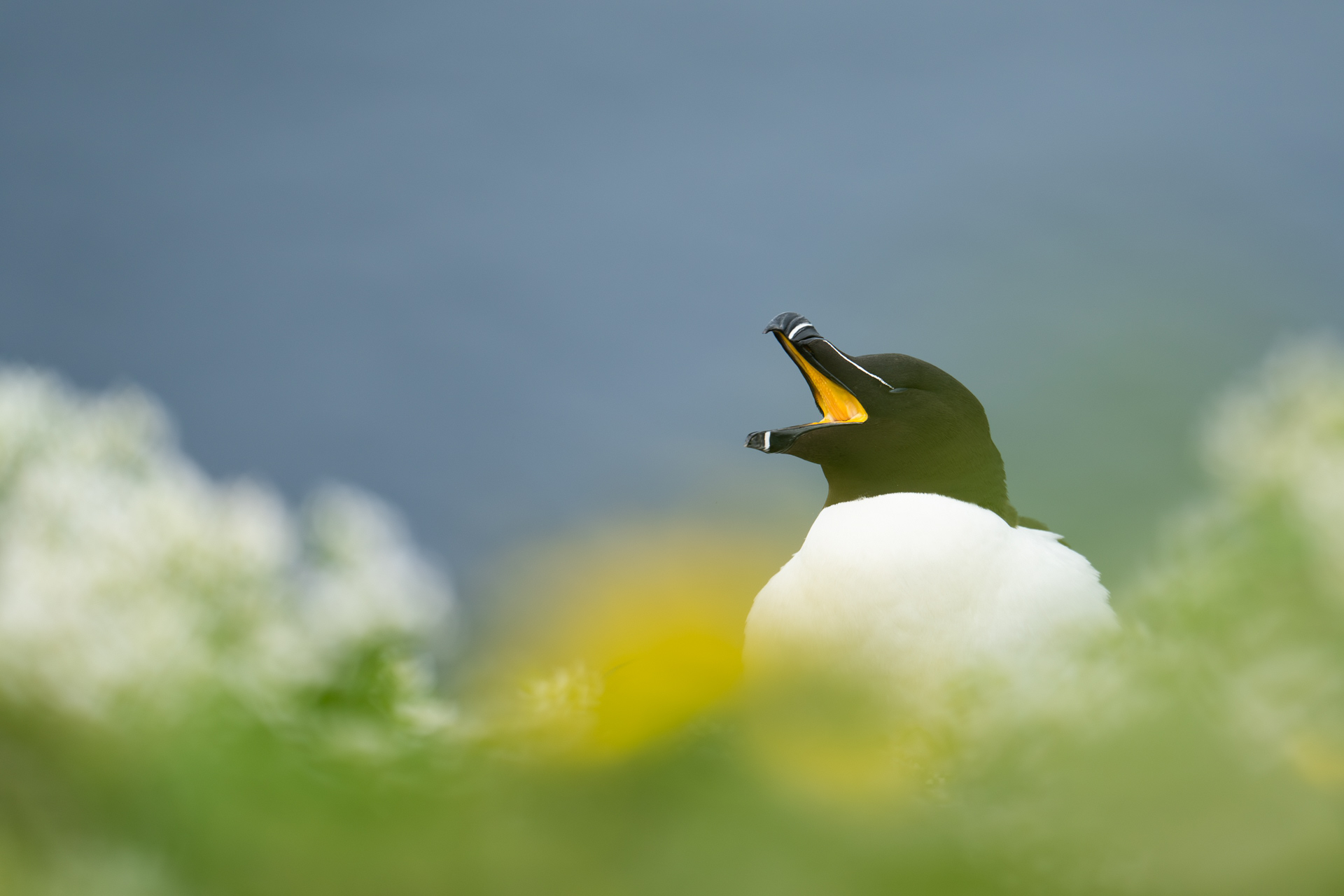 Their minimalism makes the razorbill and the guillemot among my favourite birds of seabird colonies. I find the white lines on the razorbill's bill and the white eye line truly beautiful! It gives them a certain mystery, a certain wisdom. Perhaps their true beauty lies within their mouths, their striking yellow palate.