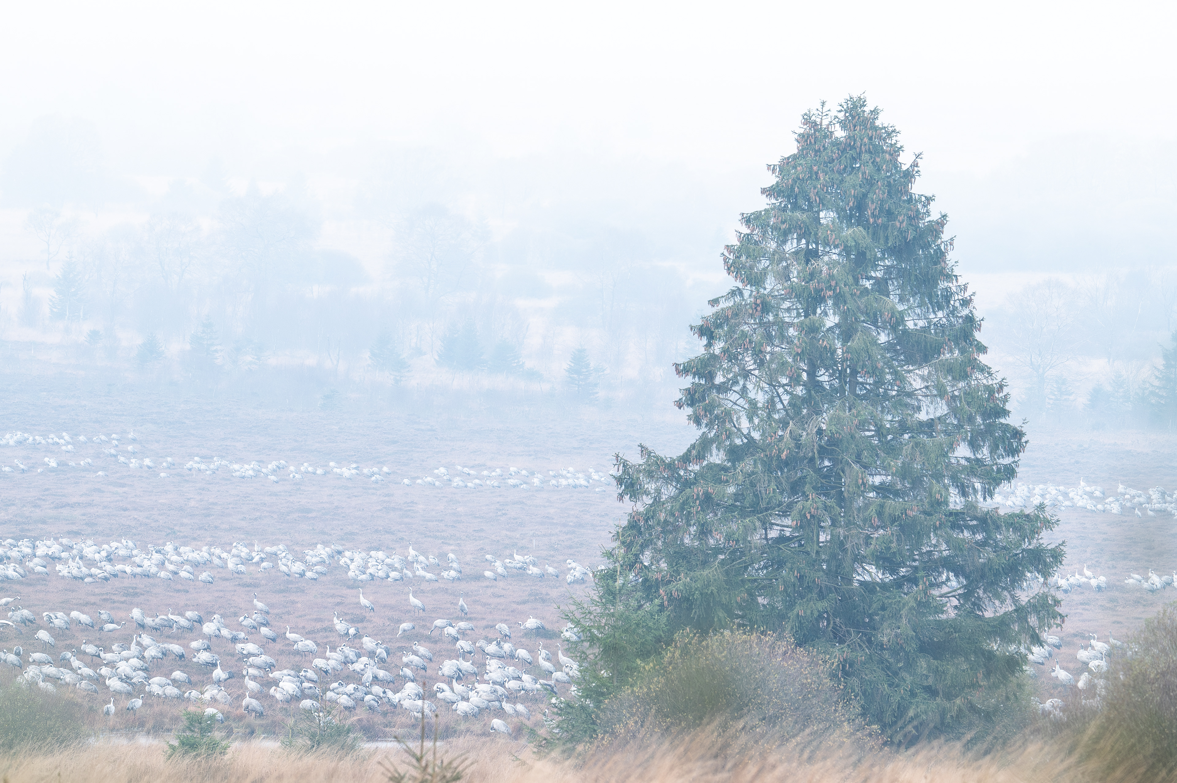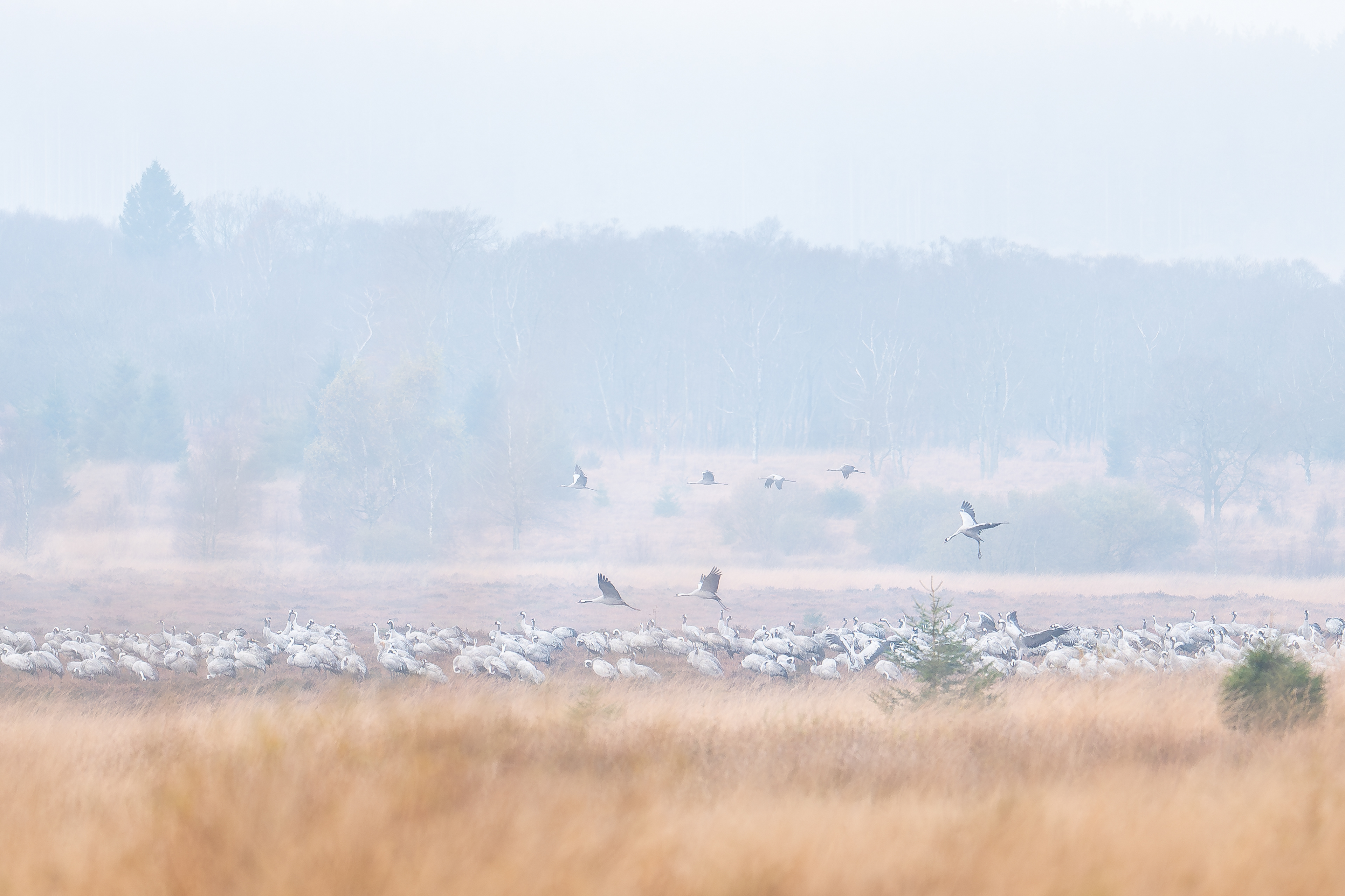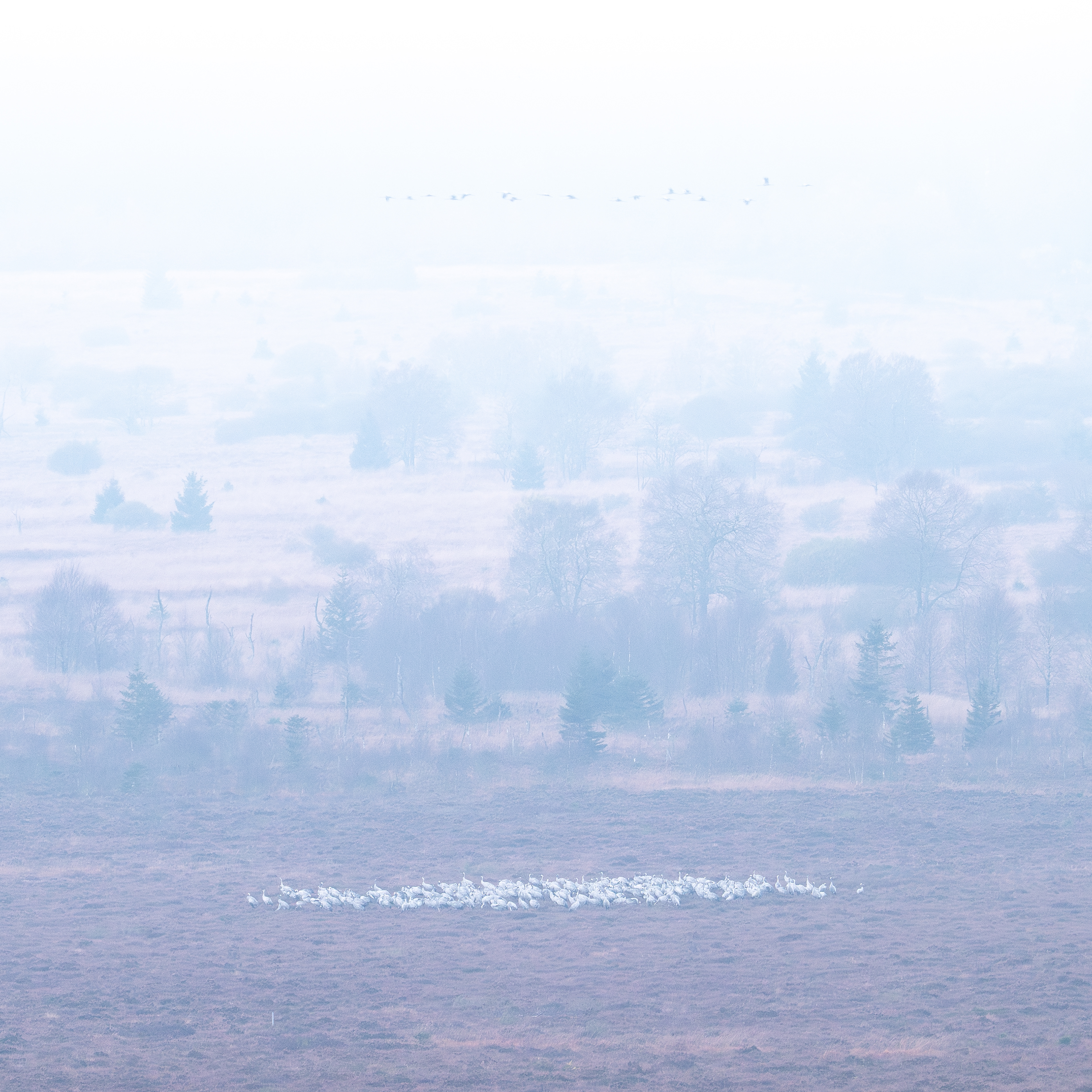 The next morning, I wake to the now-familiar din. Yes, they're still there! I quickly pack up my things. Roughly estimated, about five thousand cranes have spent the night before me in the fens. Further into the mist, I can see a few more groups. The fog lingers, so the great exodus doesn't begin until around ten o'clock.
