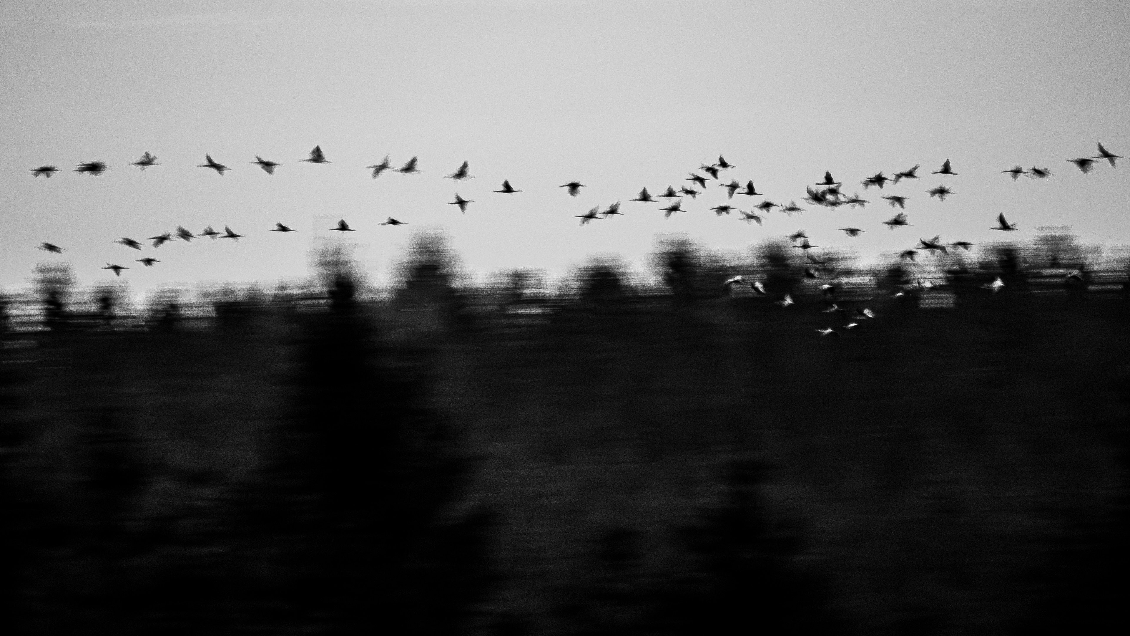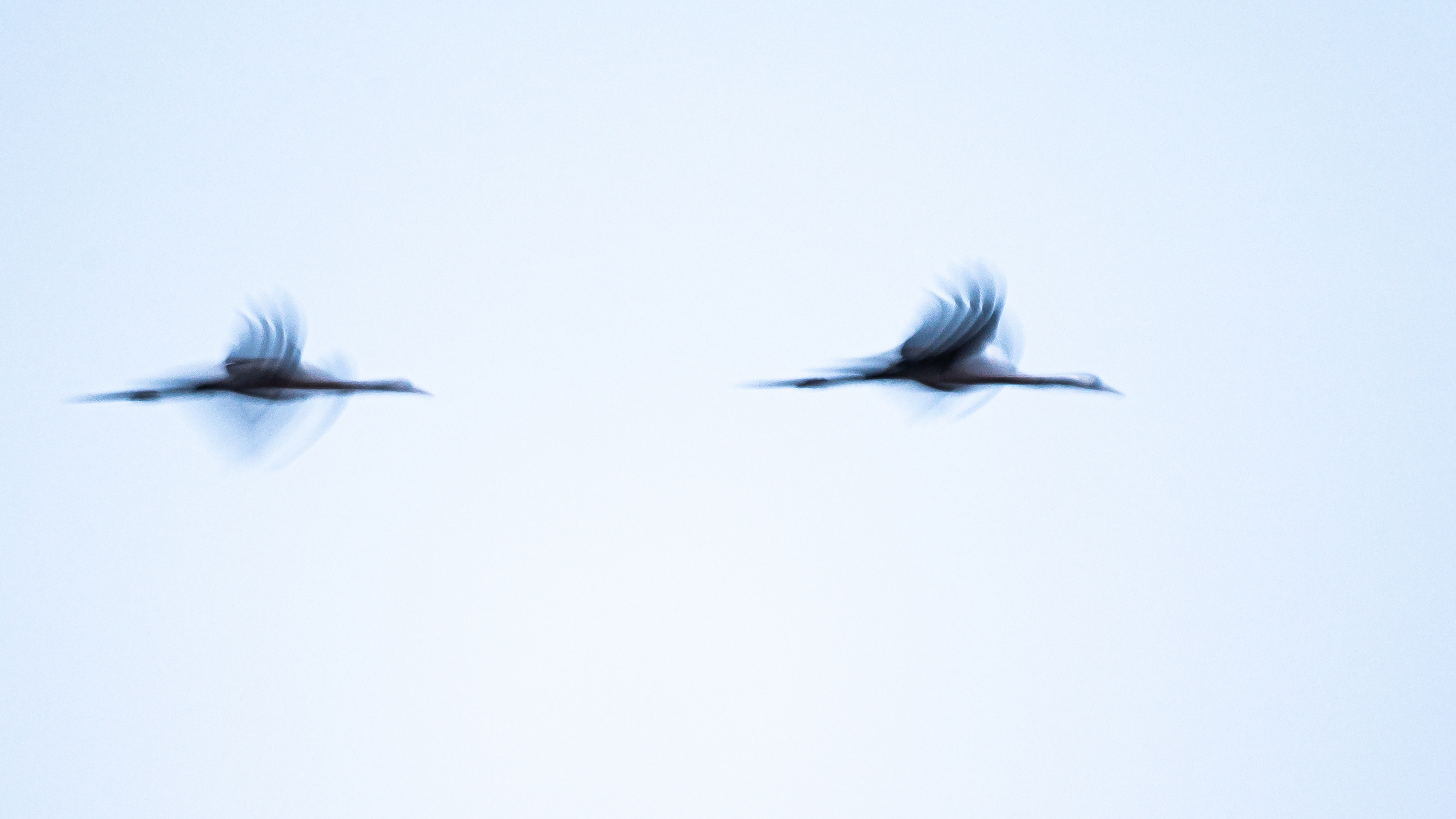 The day is drawing to a close, and the cranes keep coming. Besides the loud trumpeting of the adults, I also hear the endearing calls of the first-year birds. They are learning the long journey by following the adults.