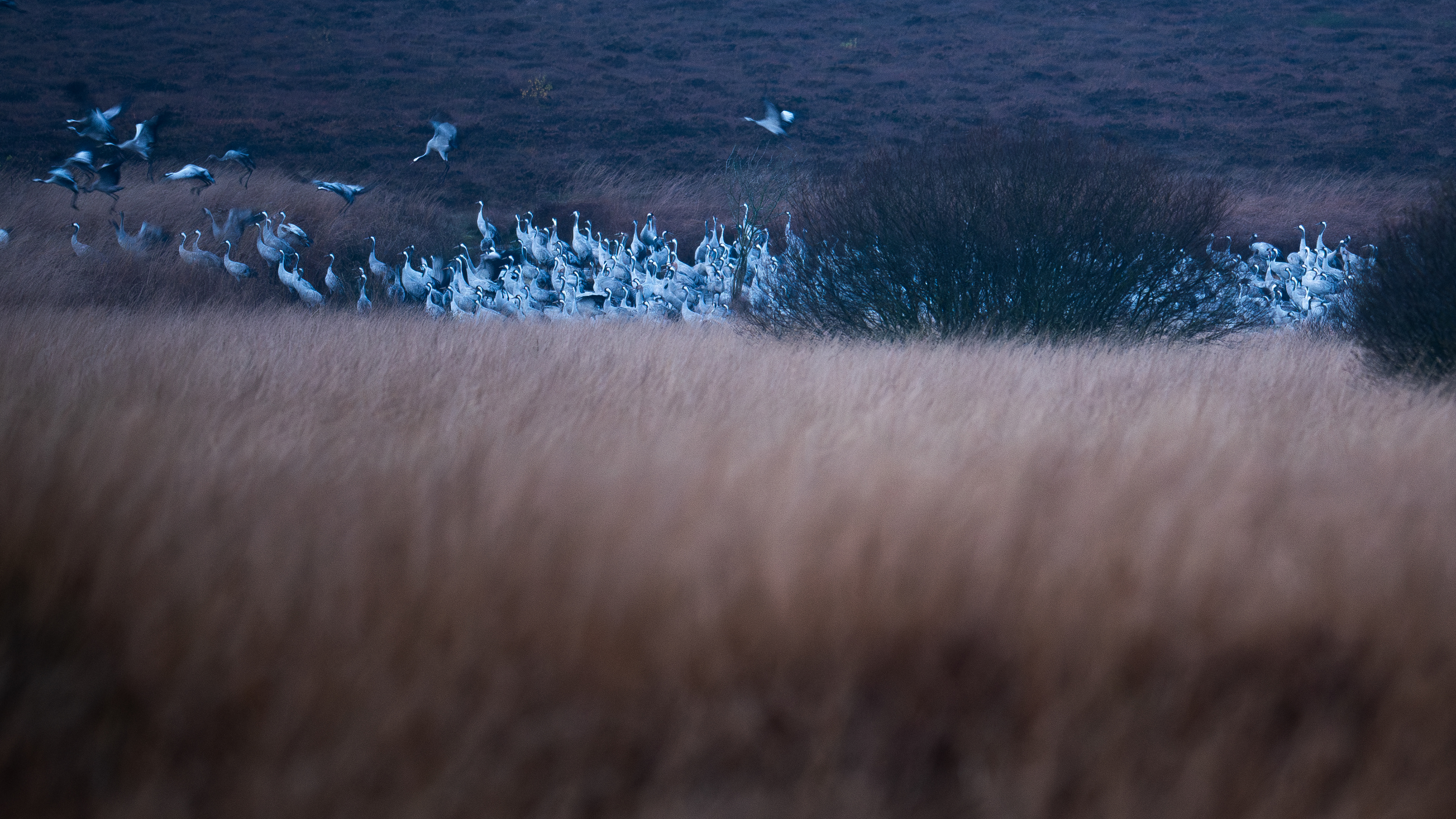 Arriving at the roost, I see several thousand cranes: a sublime sight, surrounded by a heavenly din. A male hen harrier crosses the landscape in silent flight. The cranes come flying in, calling loudly. This bodes well for tonight and tomorrow morning. I won't get much sleep — a few thousand cranes might keep me awake.
